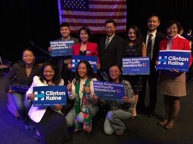 支持柯林頓的代表在辯論會後合影。(記者羅曉媛/攝影)